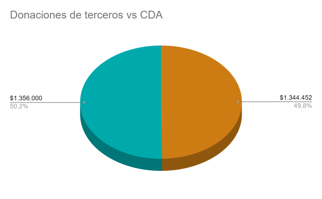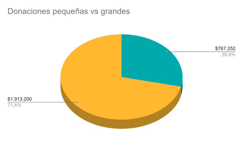 Además, las donaciones iguales o inferiores a $50.000 CLP —que definimos como donaciones pequeñas— sumaron $799.500, lo que representa un 29,5% del total recaudado. Este monto incluye aportes de personas externas y también donaciones realizadas desde el propio círculo.